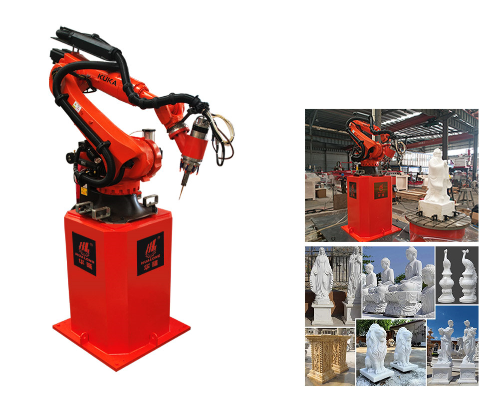 HLRB-7A3D 7 Axis Robot is an automation integrated and secondary developedproduct on the base of KUKA robot, specially  designed for 3D stone carving process, very strong, high- precision (high-speed shaft integrated in the arm), verstile and easy to operate.It uses the offline programming system Sprut CAM to perform complex workpiece processing. The configuration can be changed at will. The robot can work normally even in harsh environments, with a service life of up to 15 years and an average time between accidents as long as 70,000 hours.